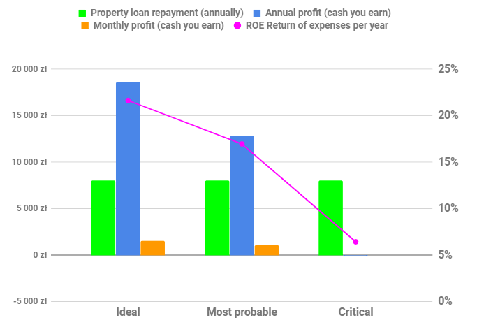 The example on the left presents three variants: the ideal one (the entire house is leased out at the highest market rate), the most probable one (the house is leased out at the average market rate) and the crisis one (the entire property is vacant for 2 months and the rate is lower than the market average).